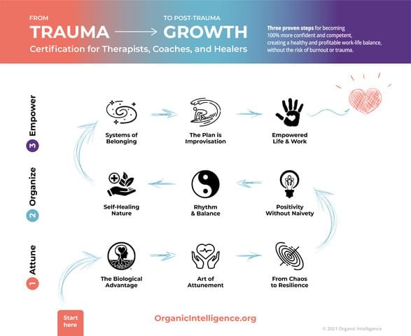 Get the Organic Intelligence® Map to Post-Trauma Growth that Therapists, Coaches and Healers are Using to Increase their Confidence and Competence, Without the Risk of Burnout or Trauma.